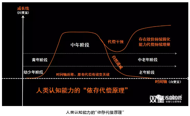 在該模型中,我們能夠看到人類的認(rèn)知從幼少年階段開始,經(jīng)過青年階段,到達(dá)中年階段的巔峰期。但隨著年齡的不斷增長,人類的認(rèn)知能力開始自然遞減,最終接近幼少年時(shí)期的認(rèn)知能力。在這個過程中,如果人類想要改變這一自然的“墮變規(guī)律”,就必然需要通過“代償干預(yù)”,對自身進(jìn)行不斷地調(diào)整和干預(yù),從而讓認(rèn)知能力從“下墮”走向“上揚(yáng)”,讓能力代償持續(xù)增量!