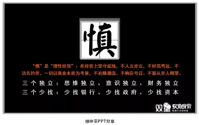 答:在流變時代下,企業(yè)要很好的“活著”,要有品質(zhì)、有尊嚴(yán)、有溫情、有責(zé)任、可持續(xù)發(fā)展,首先要具備的就是“慎”。在經(jīng)營上要有自己的獨(dú)立判斷,堅(jiān)守底線,不人云亦云,一切以商業(yè)本質(zhì)為考量,不追隨潮流、不響應(yīng)號召、不盲從旁人期望?;谝陨?,樓仲平也總結(jié)出“三個獨(dú)立”和“三個少找”: