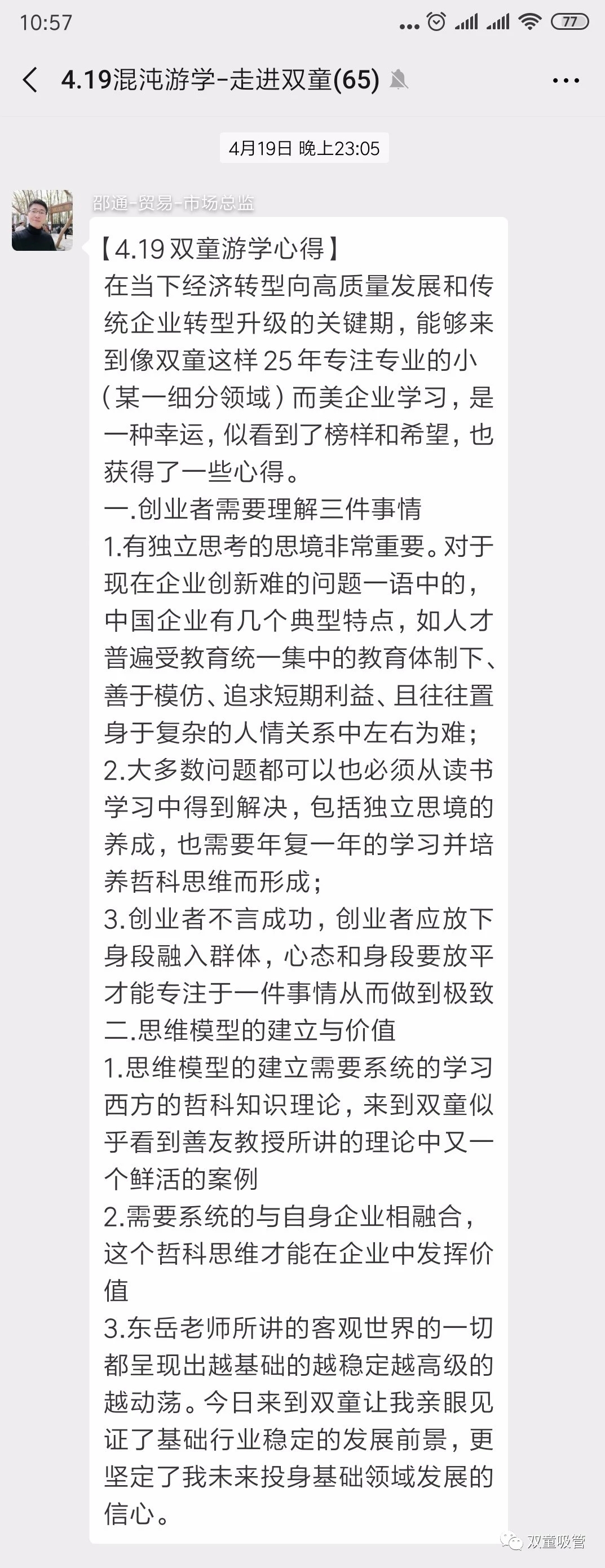 最后,也感謝混沌大學(xué)的同學(xué)們能夠如此認(rèn)真和熱情地參與到此次游學(xué)活動中來,歡迎大家下次再來“雙童”做客哦!