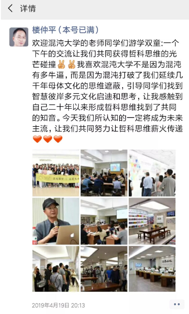 樓仲平也在朋友圈里分享了當(dāng)天的感想,希望能和混沌大學(xué)的同學(xué)們共同努力,讓哲科思維薪火傳遞!