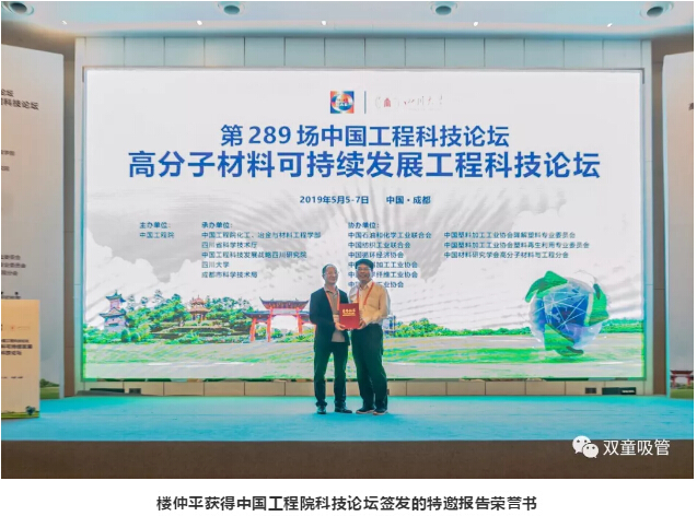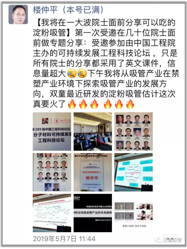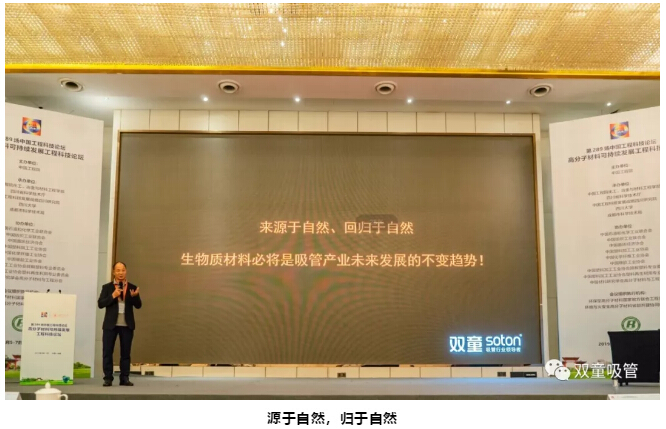 在這樣“談笑有鴻儒,往來無白丁”的重要場(chǎng)合,所有院士的分享都采用了英文課件,信息量超大。作為受邀分享嘉賓之一,“雙童”樓仲平也從吸管產(chǎn)業(yè)角度出發(fā)分析在禁塑大趨勢(shì)下吸管行業(yè)的發(fā)展方向,為大家?guī)砹?/span>《生物降解材料應(yīng)用是吸管產(chǎn)業(yè)的未來發(fā)展趨勢(shì)》主題分享!