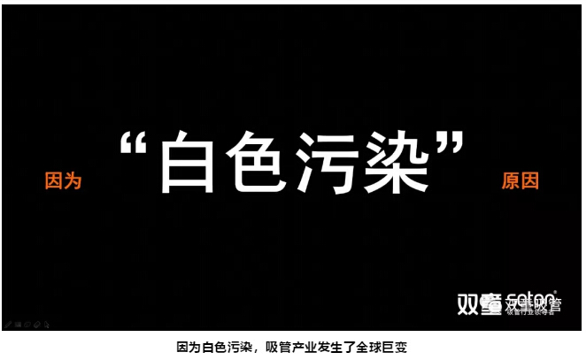 首先,樓仲平用一組精美的產(chǎn)品圖片向大家展示了“雙童”各式各樣的創(chuàng)新吸管,打破了大家認(rèn)為吸管是“低、小、散、弱”小商品的傳統(tǒng)認(rèn)知。而當(dāng)大家都還沉浸在吸管還可以有這么多花樣的認(rèn)知時(shí),樓仲平卻話鋒一轉(zhuǎn),向大家說明:“看起來很美的吸管產(chǎn)業(yè)突然有一天發(fā)生了全球巨變!”