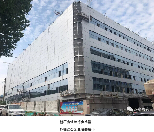 “雙童”二期智能化工廠按高規(guī)格的商業(yè)建筑等級(jí)設(shè)計(jì),在大樓的外墻材料選擇上,“雙童”選擇了高等級(jí)的鋁合金幕墻材料,鋼性好、重量輕、強(qiáng)度高,耐腐蝕性。如今,廠房外墻已初步成型,工人正在安裝鋁合金幕墻和窗戶,施工完畢后將更具現(xiàn)代感和科技感!