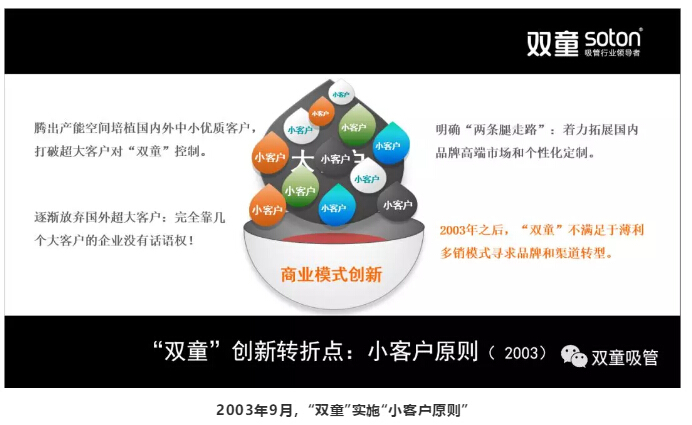2003年9月,“雙童”實(shí)施“小客戶原則”,通過商業(yè)模式改革,改變了原來薄利多銷的粗放經(jīng)營(yíng)模式,通過獨(dú)樹一幟的銷售創(chuàng)新形成差異化錯(cuò)位競(jìng)爭(zhēng),逐漸遠(yuǎn)離同行之間惡性競(jìng)爭(zhēng),在持續(xù)積累下獲得全球吸管產(chǎn)業(yè)話語權(quán)和規(guī)則制定權(quán)。
