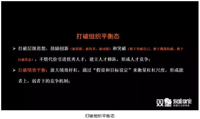 打破層級思想,鼓勵創(chuàng)新(新思想、新技術(shù)、新動能)和突破(敢于突破自己、敢于挑戰(zhàn)權(quán)威、敢于打破常態(tài)),不惜代價引進優(yōu)秀人才,建立人才梯隊,形成人才競爭; 打破績效平衡:放大績效桿杠,通過“假設和目標設定”來衡量杠杠尺度,形成能者上,弱者下的競爭機制;