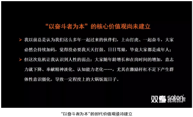 緊接著,樓仲平提出了“‘雙童’不是你的家,沒(méi)有‘動(dòng)力’請(qǐng)回家!”的觀點(diǎn),引出第二個(gè)主題——“以?shī)^斗者為本”的價(jià)值觀。
