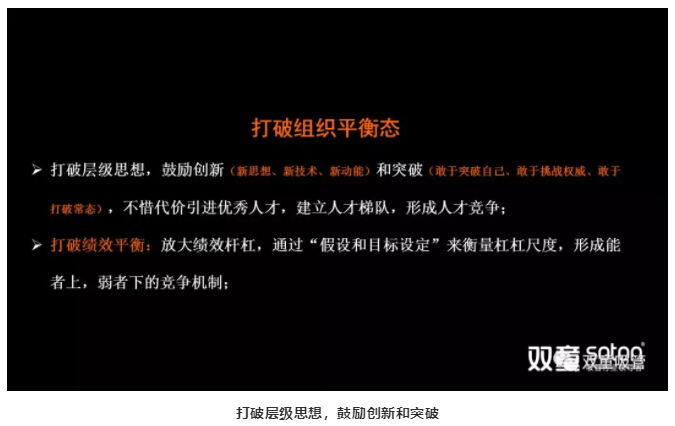 最后,樓仲平也希望通過(guò)此次改革,能讓“雙童”的管理發(fā)揮人性的激情,打破教條和大鍋飯,打破原來(lái)的死氣沉沉和思維僵化,讓擔(dān)當(dāng)者多得,讓逃避者少得,讓無(wú)能者出局,讓后來(lái)者上位,讓無(wú)畏者居高位,讓優(yōu)秀的員工和管理者得到應(yīng)有的肯定!