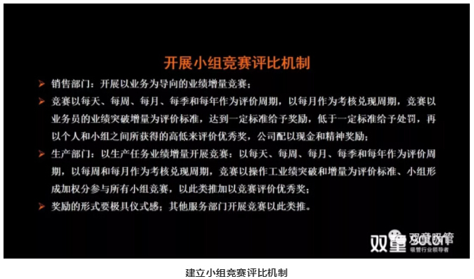 生產(chǎn)部門(mén):以生產(chǎn)任務(wù)業(yè)績(jī)?cè)隽块_(kāi)展競(jìng)賽;以每天、每周、每月、每季和每年作為評(píng)價(jià)周期,以每周和每月作為考核兌現(xiàn)周期,競(jìng)賽以操作工業(yè)績(jī)突破和增量為評(píng)價(jià)標(biāo)準(zhǔn)、小組形成加權(quán)分參與所有小組競(jìng)賽,以此類(lèi)推加以競(jìng)賽評(píng)價(jià)優(yōu)秀獎(jiǎng);