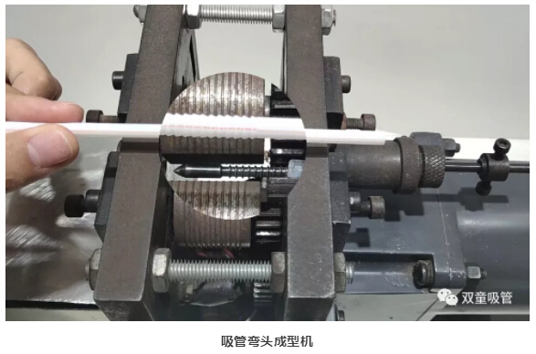 再通過這臺彎頭成型機(jī),將擠出的直吸管放入其中,壓出折彎波紋。