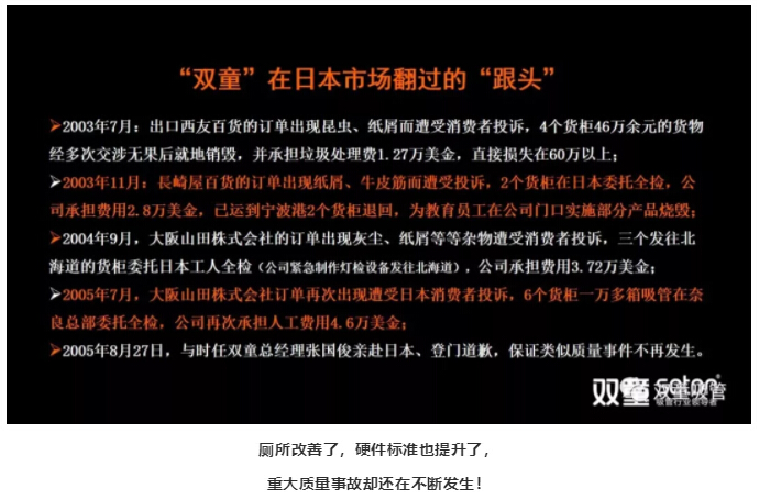 但廁所改善了,生產(chǎn)環(huán)境優(yōu)化了,硬件標(biāo)準(zhǔn)也提升了,重大質(zhì)量事故卻還在不斷發(fā)生!前前后后七八年的時(shí)間里,“雙童”在日本市場栽了不少“跟頭”,虧損了大量資金,在這樣的情況下,選擇“死磕”還是“放棄”?