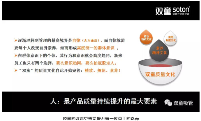 堅(jiān)持或放棄僅一念之差,一秒鐘就可以放棄,但放棄了就沒有今天的“雙童“!最終,“雙童”選擇了持續(xù)“死磕”!這個(gè)過程中,“雙童”逐漸認(rèn)知到,質(zhì)量管理體系建設(shè),除了硬件之外,還需要制度化管理。