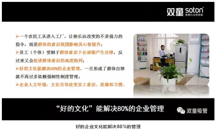 因此,好的企業(yè)文化能解決80%的管理,一旦形成了群體自律就不再過多依賴強(qiáng)制性制度管理,從而形成企業(yè)特有的文化價(jià)值觀!