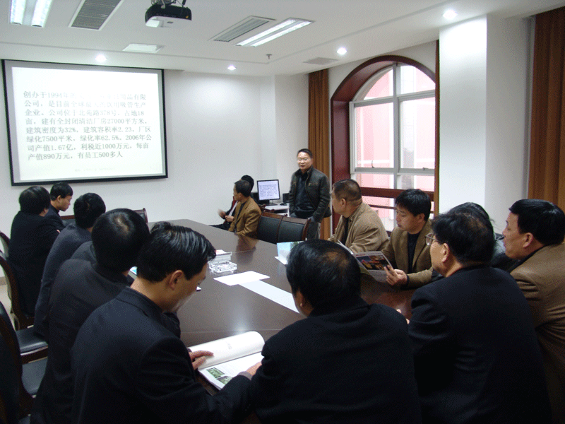 2007年12月25日上午,義烏市宣傳部協(xié)同陜西戶縣政府考察團(tuán)來我公司考察,公司總經(jīng)理助理盧程航進(jìn)行了熱情接待,并向考察團(tuán)詳細(xì)介紹了公司發(fā)展歷程、產(chǎn)品質(zhì)量、起草國(guó)家標(biāo)準(zhǔn)、循環(huán)經(jīng)濟(jì)建設(shè)、企業(yè)文化和諧理念等方面。