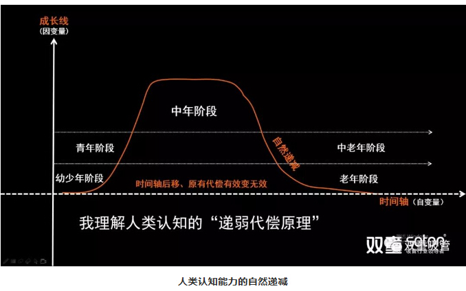 所以,我用一個(gè)“認(rèn)知能力”思維模型給大家說明:人類發(fā)展中的成長性是能夠無窮拓展的。比如正常來講,看一個(gè)人的認(rèn)知能力,從幼年、少年、青年,到中年處于一個(gè)鼎盛階段,到中老年階段之后就進(jìn)入到自然遞減的過程。