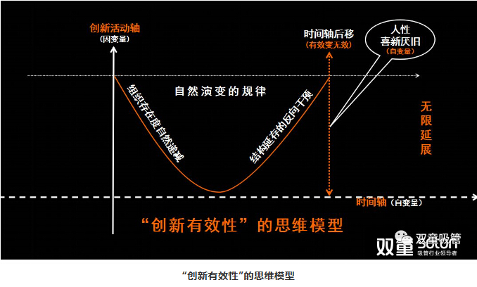 通過宇宙演化、生物進(jìn)化等自然規(guī)律的演繹,我們能夠認(rèn)知到創(chuàng)新是“喜新厭舊”的應(yīng)變反饋。這就說明了:創(chuàng)新有“時(shí)間軸”,隨著“時(shí)間軸”不斷后移,原有的“創(chuàng)新”開始失效,最后變成了無效,創(chuàng)新活動也就“無窮無盡”!