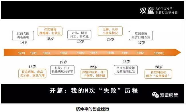 在視頻中,樓仲平生動的講述了他對于創(chuàng)業(yè)的理解和對吸管行業(yè)的堅守。實際上,樓仲平在初中時期就因為家庭貧困跟隨父親到江西雞毛換糖,四處漂泊,在尋找安身立命之處時,同時也在外面發(fā)現(xiàn)了更為宏大的世界。在這個過程中,唯一不變的就是他對美好生活始終充滿了向往!下面,吸管妞帶大家回顧一下樓仲平的創(chuàng)業(yè)歷程:https://v.qq.com/x/page/p3014iuf3mf.html