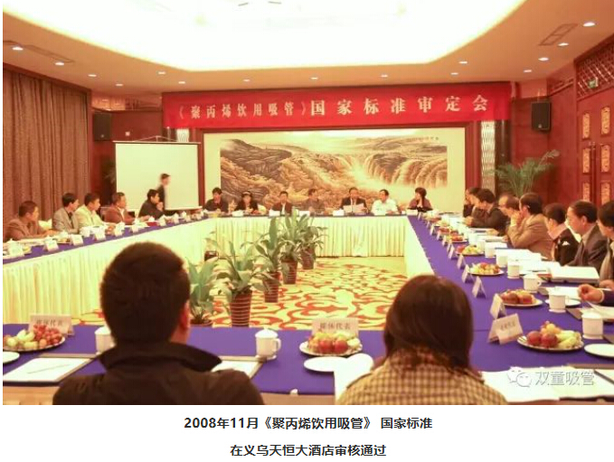 其實(shí),在標(biāo)準(zhǔn)編制起草過程中,“雙童”也曾邀請(qǐng)一些同行企業(yè)共同參與,但由于當(dāng)時(shí)大家的標(biāo)準(zhǔn)意識(shí)還比較薄弱,再加上標(biāo)準(zhǔn)編制過程中還需要企業(yè)承擔(dān)一定費(fèi)用,這讓其他企業(yè)都望而卻步,“雙童”自然地成為了吸管行業(yè)承制國家標(biāo)準(zhǔn)的單一企業(yè)。2008年11月,《聚丙烯飲用吸管》 國家標(biāo)準(zhǔn)審定會(huì)在義烏天恒大酒店召開。會(huì)上審核通過了該項(xiàng)國家標(biāo)準(zhǔn),成為當(dāng)時(shí)金華地區(qū)第一件完全意義上的國家標(biāo)準(zhǔn)。