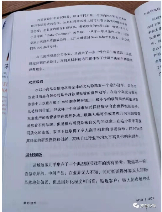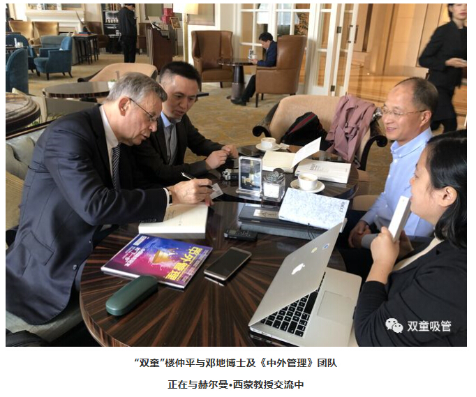 中國企業(yè)千千萬,說到“隱形冠軍”也有不少,可為何此次《中外管理》雜志特別邀請(qǐng)了樓仲平一同前往采訪西蒙教授呢?原來,早在2018年的首屆“中國造·隱形冠軍”評(píng)選活動(dòng)中,“雙童”就經(jīng)過陳春花教授等七位評(píng)委專家的評(píng)選,從24家優(yōu)秀企業(yè)中脫穎而出,被推選為首批“中國造·隱形冠軍”。除此之外,在西蒙教授最新所著的《隱形冠軍》一書中,“雙童”也作為隱形冠軍企業(yè)案例被收錄其中!所以,此次的采訪“隱形冠軍之父”西蒙教授之行,“雙童”樓仲平作為中國隱形冠軍企業(yè)代表參與其中,也是再合適不過了!