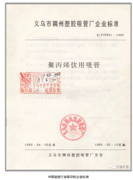 建設工廠缺少資金,樓仲平不僅把全部積蓄投進去,還關掉了義烏市場一直在盈利的攤位;沒有行業(yè)標準,只有小學文化的他,自己埋頭鉆研制定指標、量化參數(shù)。1997年10月,由“雙童”起草的Q/YCSX01《聚丙烯飲用吸管》企業(yè)標準審核通過,成為吸管行業(yè)最早的產(chǎn)品標準。