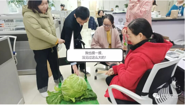 進(jìn)入辦公室以后,依舊沒(méi)有被“放過(guò)”!大家看到如此大的白菜,都伸出手來(lái),想要沾沾“大”氣!