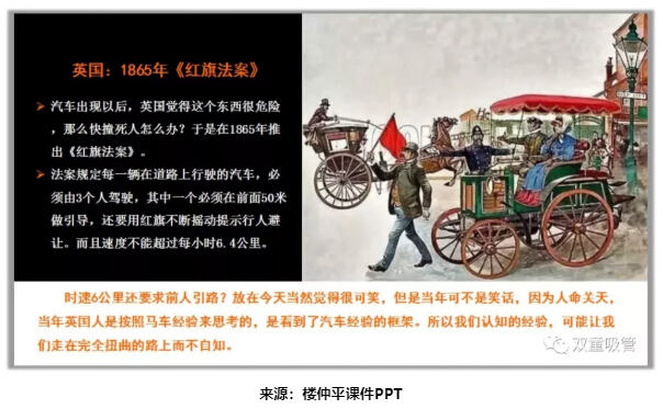 實(shí)際上,這就是“經(jīng)驗(yàn)”在作祟。我們現(xiàn)代人之所以覺得《紅旗法案》很可笑,是建立在我們對如今汽車的認(rèn)知經(jīng)驗(yàn)上。而當(dāng)時(shí)的英國人則是建立在對當(dāng)時(shí)盛行的馬車的認(rèn)知經(jīng)驗(yàn)上。