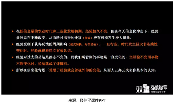 當(dāng)經(jīng)驗(yàn)不變而事物不斷變化時(shí),經(jīng)驗(yàn)就成了絆腳石!因此,如果你在信息化社會(huì)還一直局限在以往的經(jīng)驗(yàn)里面,就會(huì)忽視外部世界的變化,人云亦云,失去基本的認(rèn)知,從而錯(cuò)失了已經(jīng)發(fā)生的機(jī)會(huì)。
