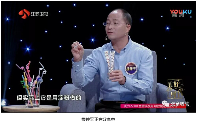 在“雙童”樓仲平上場(chǎng)后,主持人趙丹軍就被桌子上的各類吸管所吸引啦!樓仲平也向在場(chǎng)觀眾介紹了美觀環(huán)保的可降解吸管和極具特色的創(chuàng)新吸管。