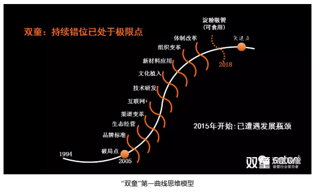 上述思維模型是“雙童”從1994年起步,但在2005年遭遇了發(fā)展瓶頸,雖然通過后續(xù)各個(gè)時(shí)期的錯(cuò)位競(jìng)爭(zhēng),不斷創(chuàng)新一步步堅(jiān)持到現(xiàn)在,但是“雙童”的今天已是持續(xù)錯(cuò)位到了極限點(diǎn)的狀態(tài),已經(jīng)遇到天花板。