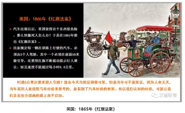 1865年,由于懼怕汽車速度過(guò)快撞到行人,英國(guó)議會(huì)出于安全考量通過(guò)了一部《機(jī)動(dòng)車法案》,即后來(lái)被人嘲笑的《紅旗法案》。在這部法案中規(guī)定:每一輛在道路上行駛的機(jī)動(dòng)車,必須由3個(gè)人駕駛,其中一個(gè)必須在車前面50米以外做引導(dǎo),還要用紅旗不斷搖動(dòng)為機(jī)動(dòng)車開(kāi)道,并且速度不能超過(guò)每小時(shí)4英里(每小時(shí)6.4公里)。