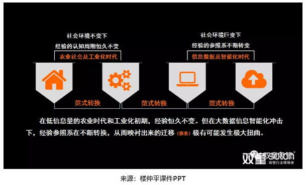 因此,在時(shí)代背景的轉(zhuǎn)變下,我們?cè)日J(rèn)知的經(jīng)驗(yàn)很有可能就成了絆腳石。下面,樓仲平繼續(xù)引導(dǎo)大家理解這頁(yè)PPT: