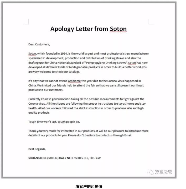開展后,我們也遭遇了一大難題。由于中國疫情原因,客戶對中國館充滿顧慮,甚至不愿意走進攤位中和業(yè)務(wù)員溝通。此時,“雙童”團隊寫了一封給客戶的道歉信(介紹雙童基本情況、不能親臨現(xiàn)場的原因),并粘貼客戶告知書(告知兩位業(yè)務(wù)員是長期在德留學生,短期內(nèi)未回過中國),從而消除了客戶們的顧慮。