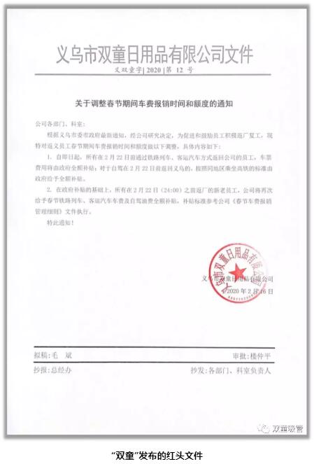 “雙童”作為義烏第一批復(fù)工企業(yè),早已建立企業(yè)防疫復(fù)工的工作流程體系,并成為復(fù)工防疫的模范企業(yè)。