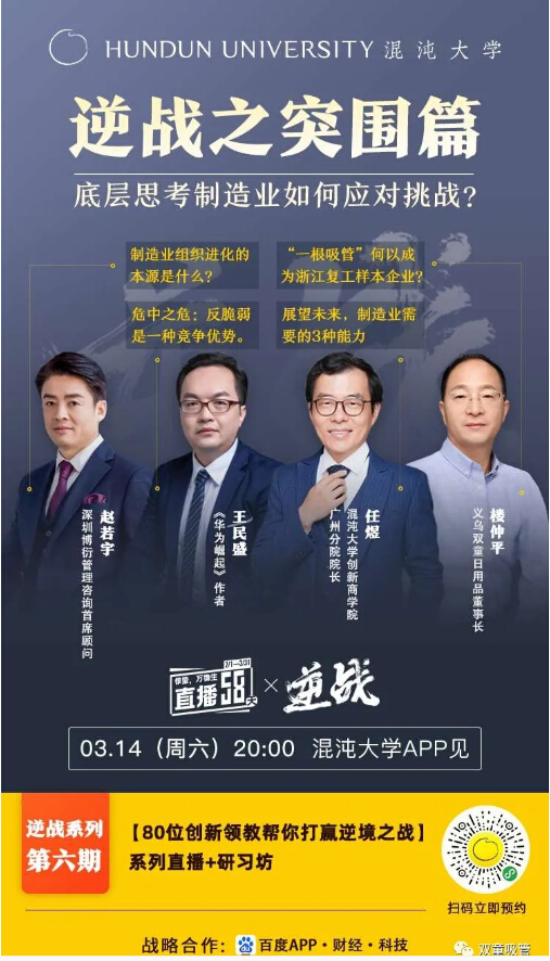 近日,“雙童”樓仲平受邀在混沌大學(xué)APP和混沌領(lǐng)教任煜、王民盛、趙若宇等老師,圍繞逆戰(zhàn)之突圍篇——制造業(yè)如何應(yīng)對挑戰(zhàn)主題進(jìn)行分享互動。樓仲平也借此機(jī)會線上分享了“雙童”的復(fù)工反思錄,引起數(shù)萬人觀看。