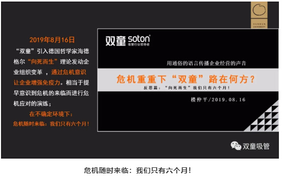 早在2019年8月16日,“雙童”再次推動企業(yè)重大改革,引入德國哲學(xué)家海德格爾的“向死而生”理論,讓團(tuán)隊認(rèn)知到雙童離“死亡”只有六個月,以此激發(fā)員工的危機(jī)感,讓企業(yè)增強(qiáng)免疫能力。這相當(dāng)于提早六個月讓員工們進(jìn)行了危機(jī)應(yīng)對的演練,從而在不確定的環(huán)境下,讓所有組織成員意識到危機(jī)隨時可能來臨。