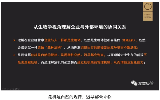 從生物學(xué)視角理解,樓仲平認(rèn)為:企業(yè)經(jīng)營中企業(yè)與人一樣都是生物體,既然是生物體就都會染病(遭遇危機(jī)),既然會染病就一樣遵循“森林法則”,從而理解組織生存的前提是適應(yīng)環(huán)境而不斷進(jìn)化。