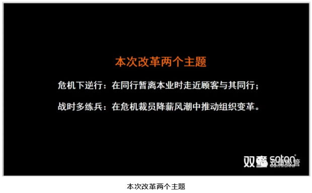 因此,在危機來臨之時,“雙童”并沒有恐慌,而是選擇抓住機會,迎接挑戰(zhàn)。但是在很多身邊的同行都開始轉(zhuǎn)行做口罩,做防疫物資的時候,奉行長期主義的“雙童”認(rèn)為,轉(zhuǎn)行踩風(fēng)口做口罩我們并不擅長。所以,4月2日,“雙童”開始推動企業(yè)第二波改革活動,明確推動組織效率的提升。