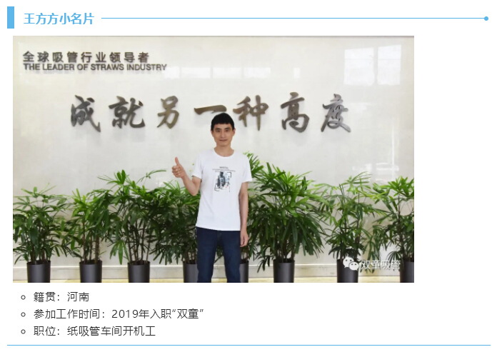 紙吸管車(chē)間開(kāi)機(jī)工王方方就是其中一員,他在“雙童”工作的短短一年內(nèi),連續(xù)四次在小組競(jìng)賽中斬獲第一,并獲得了“2019年度十佳員工”稱號(hào)!為何他能屢次獲得榮譽(yù)?他身上又有哪些閃光點(diǎn)?一起來(lái)看看吧!