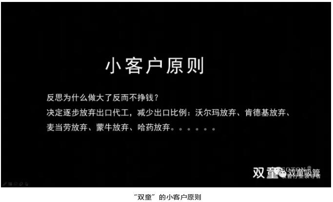 但是光鮮的出口業(yè)績背后卻暗流涌動,客大欺店,“雙童”毫無還價之力,利潤被擠壓到所剩無幾?!叭绻?個大客戶頂10個小客戶,我為什么不去找10個小客戶來做生意呢?大客戶他說了算,小客戶我們能商量?!?003年,居安思危的樓仲平提出一個理論——小客戶原則,這套理論后來被當(dāng)做MBA教材案例。