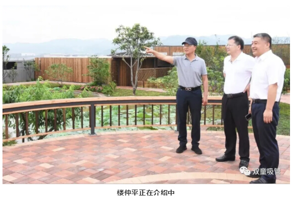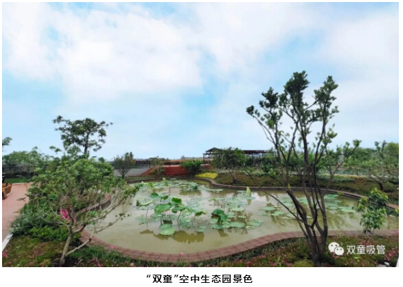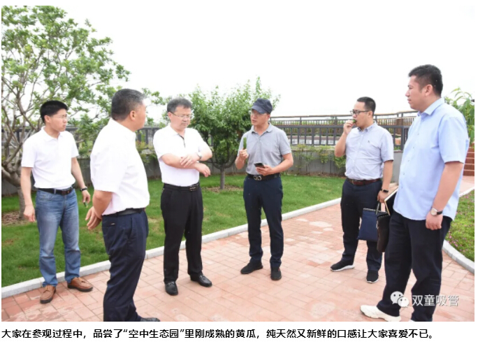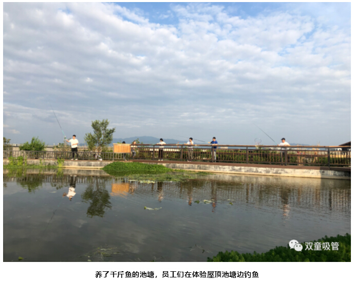 最后,樓仲平陪同李中文社長一行來到“雙童”新廠房的“空中生態(tài)園”,樓仲平介紹道:“這里栽種了200多棵果樹,還有各種蔬菜基地、藕塘、百花苑、還有養(yǎng)了千斤魚的池塘、標準的籃球場......