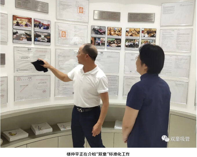來到吸管發(fā)展資料展示區(qū)時,董事長樓仲平介紹道:“‘雙童’一直在推動標(biāo)準(zhǔn)化工作創(chuàng)新,給員工提供了施展才華的舞臺。公司的標(biāo)準(zhǔn)化工作都是由以總經(jīng)理李二橋為代表的職工團(tuán)隊起草編制的,各類產(chǎn)品的知識產(chǎn)權(quán)都來源于全體職工的創(chuàng)新思維。十年時間里,我們的團(tuán)隊完成了6件國家級標(biāo)準(zhǔn)。”