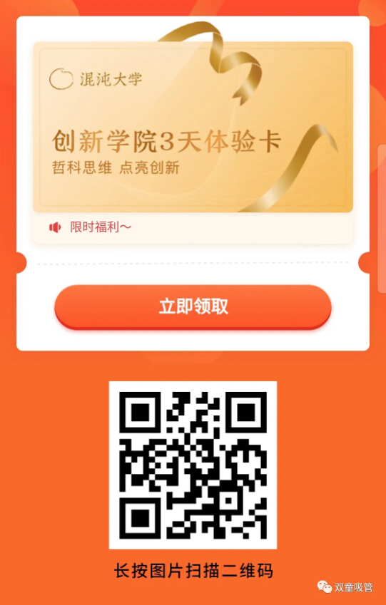 如果你還沒有聽說過混沌,如果你還持觀望態(tài)度,沒關(guān)系,我們?yōu)榇蠹覡?zhēng)取到了混沌大學(xué)最核心項(xiàng)目——?jiǎng)?chuàng)新學(xué)院的三天免費(fèi)體驗(yàn)卡,只要你掃碼下圖,即可享受為期3天的創(chuàng)新學(xué)院學(xué)籍!