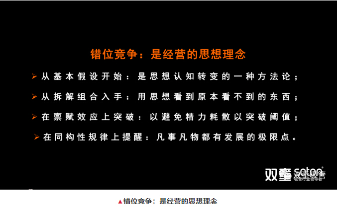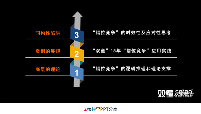 樓仲平從基本假設(shè)開始,用邏輯推理的方式一層層推進(jìn),分享了“雙童”15年“錯(cuò)位競(jìng)爭(zhēng)”的應(yīng)用實(shí)踐案例,“錯(cuò)位競(jìng)爭(zhēng)”的邏輯推理和理論支撐,從而引導(dǎo)大家深入理解錯(cuò)位競(jìng)爭(zhēng)是經(jīng)營(yíng)的思想理念,是創(chuàng)新思維的方法論。