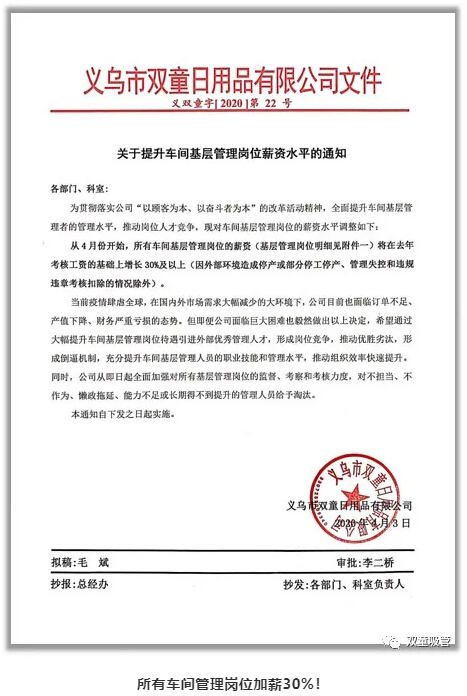 4月3日,“雙童”給所有生產(chǎn)一線(xiàn)管理人員逆勢(shì)加薪30%。消息一出,引起社會(huì)很大反響。為什么要這樣做?因?yàn)樵谝咔橹?,大量企業(yè)停產(chǎn),大量的管理人員處在流動(dòng)之中,我們意識(shí)到這是一次很好的吸納人才的機(jī)會(huì),進(jìn)而為企業(yè)未來(lái)的發(fā)展注入了新的活力。