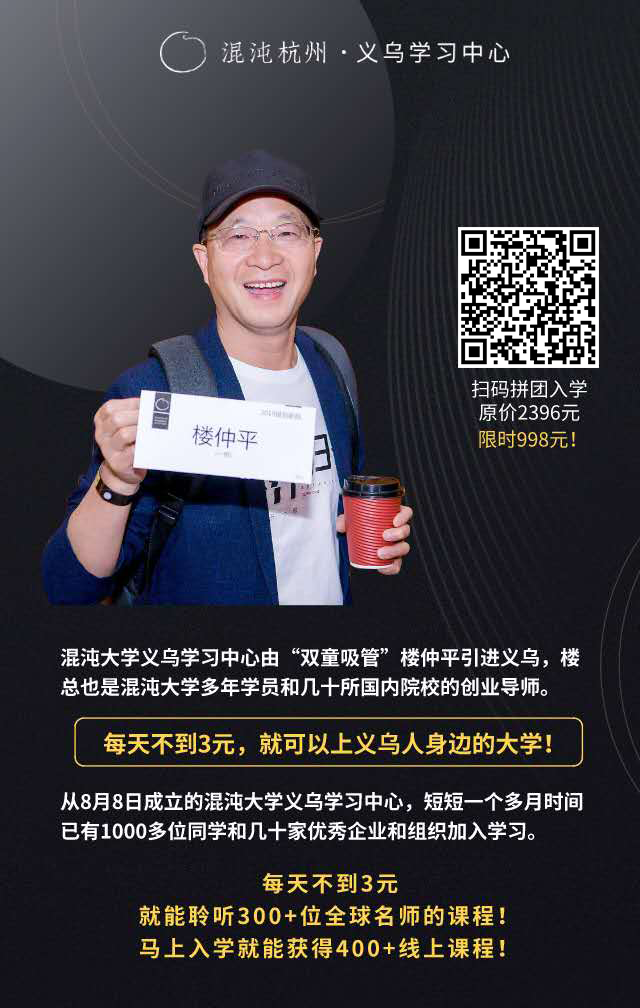 雙童將“混沌大學(xué)”引進(jìn)義烏的發(fā)心,就是想把上百堂曾經(jīng)讓雙童受益,現(xiàn)在也讓雙童不斷有新的進(jìn)步的課程,分享給每一位愛(ài)學(xué)習(xí)有夢(mèng)想,想在新時(shí)代里勇立潮頭的創(chuàng)業(yè)者們。