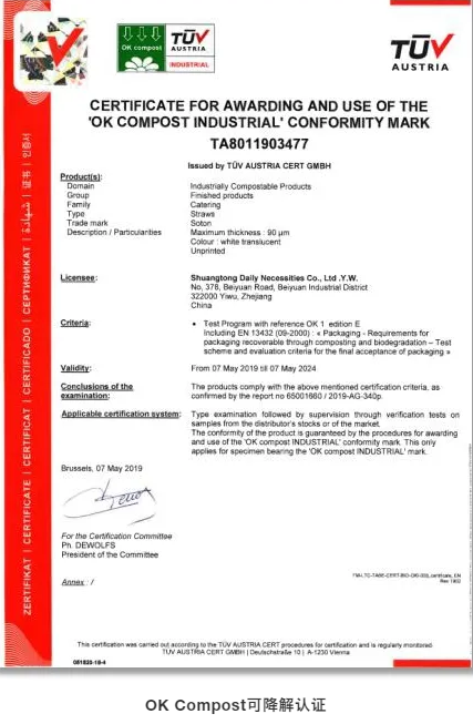 為了能夠讓客戶更加放心地選購可降解吸管,“雙童”目前已通過各類可降解產(chǎn)品的認(rèn)證資質(zhì),如北京可降解報告、國際認(rèn)證、JJ標(biāo)、海南禁塑替代品電子監(jiān)管碼等。如在海南,當(dāng)?shù)叵M(fèi)者在購買已獲電子監(jiān)管碼的禁塑替代品時,可使用手機(jī)掃描二維碼進(jìn)行識別,能夠了解到該產(chǎn)品的生產(chǎn)信息,為全生物降解塑料制品的市場監(jiān)管、質(zhì)量監(jiān)督抽查和產(chǎn)品追溯提供了便利。