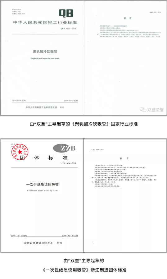 而且,從標(biāo)準(zhǔn)方面而言,“雙童”不僅主導(dǎo)制定了聚丙烯吸管行業(yè)的行業(yè)標(biāo)準(zhǔn)、國家標(biāo)準(zhǔn)和國際標(biāo)準(zhǔn),還在2014年就主導(dǎo)起草了《聚乳酸冷飲吸管》國家行業(yè)標(biāo)準(zhǔn),2019年主導(dǎo)起草了《一次性紙質(zhì)飲用吸管》浙江制造團(tuán)體標(biāo)準(zhǔn),緊握住了吸管行業(yè)的規(guī)則制定權(quán)和行業(yè)話語權(quán)!