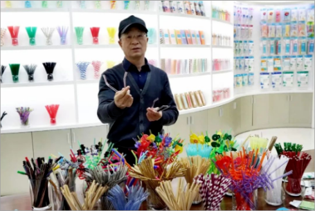 2020年12月22日,浙江義烏“雙童”董事長(zhǎng)樓仲平開心介紹展示新研發(fā)生產(chǎn)的可降解吸管。