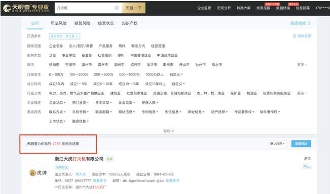 ▲以“打火機(jī)”為關(guān)鍵詞的關(guān)聯(lián)企業(yè)搜索結(jié)果。圖片來(lái)源:天眼查專業(yè)版