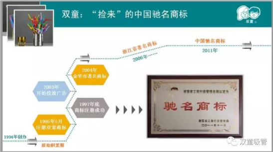 “雙童吸管”從1995年開始的品牌塑造,基本是五年一個階段,前五年基本沒有聲音,屬于積累期;第二個五年的2000年獲“義烏名牌”,2003年獲“金華市著名商標”和“金華名牌”。第三個五年從2005年之后分別獲“浙江省著名商標”、“浙江省名牌產(chǎn)品”、“浙江省知名商號”和“浙江省綠色企業(yè)”等省級榮譽稱號。一直到第四個五年之初的今年,終于獲國家工商總局的“中國馳名商標”認定。
