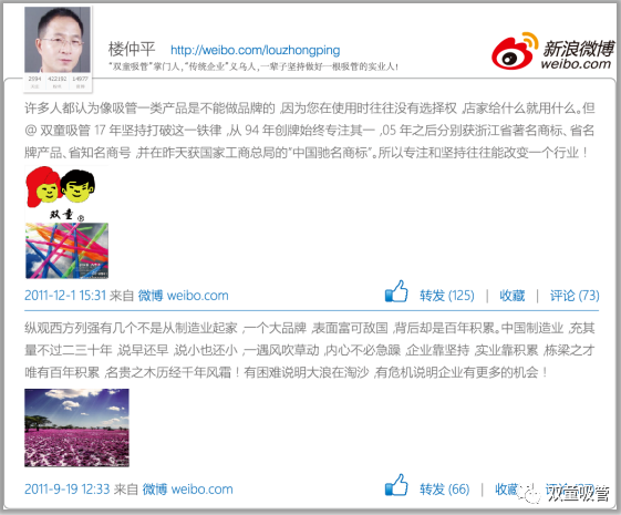 我有一個比較好的習慣就是愿意不斷地學習,我盯住一件事情就會持續(xù)去關(guān)注其發(fā)展動態(tài)并做長遠的規(guī)劃,我覺得我們的品牌塑造也是一個由低級到高級的運作過程,積累初期因為沒有經(jīng)驗,只能選擇在一些書刊和戶外廣告的途徑做一些簡單的廣告推廣,之后我們利用互聯(lián)網(wǎng)優(yōu)勢取得突破。再之是致力于企業(yè)的亮點,利用社會化媒體密集傳播而形成口碑傳播??梢哉f“雙童吸管”的馳名商標認定,幾乎不靠廣告推廣,前后十五年的時間,直接的廣告支出幾乎不超過五百萬,而省下來的大部分經(jīng)費都花到企業(yè)文化的價值觀塑造和傳播上。